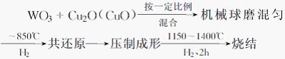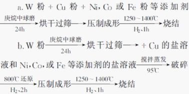 活化液相燒結即是在鎢銅材料中加入第三種金屬元素,液相燒結過程與鎢和銅生成中間相或固溶,使鎢和銅發生燒結作用。文獻[10~12]報道了兩種比典型的工藝: